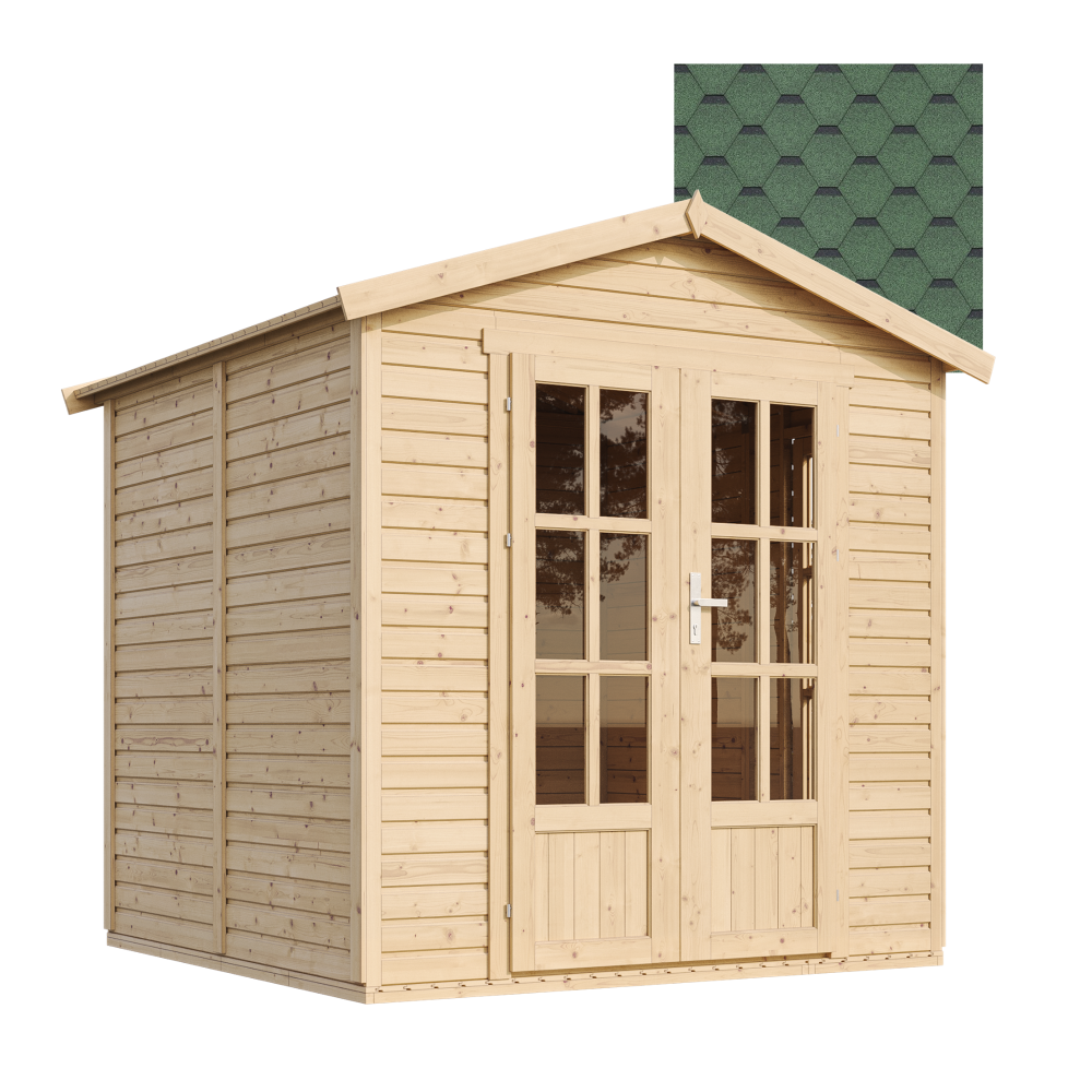 CABANE DE JARDIN À MONTAGE FACILE. Des planches de toit de 18 mm en bois de pin et d'épicéa certifiés en font un abri de jardin de haute qualité. Les panneaux de revêtement muraux à emboîtement de 16 mm et les instructions d'installation détaillées facilitent l'assemblage par 2 personnes. Le kit cabine comprend un revêtement de sol et des dalles bitumineuses de qualité (couleur en option).