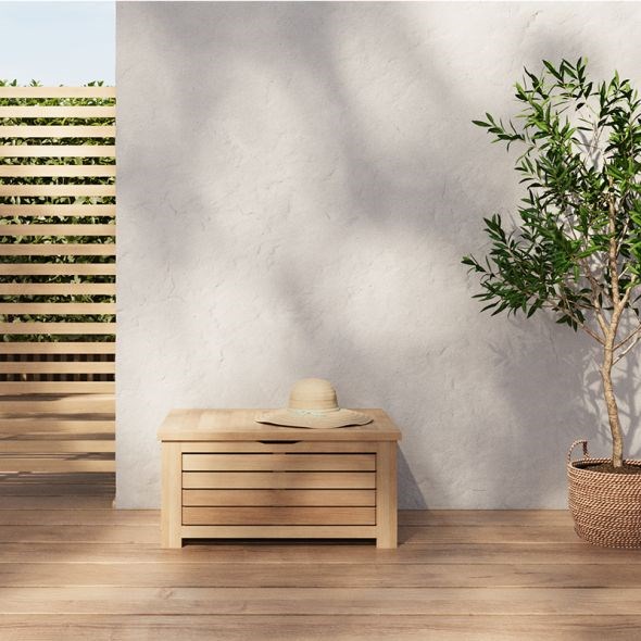 Besoin d'un rangement à la fois esthétique et pratique ? Notre petit coffre TERA en bois d'acacia FSC blanchi est la solution idéale pour stocker votre matériel de jardin, accessoires de piscine ou encore coussins extérieurs.