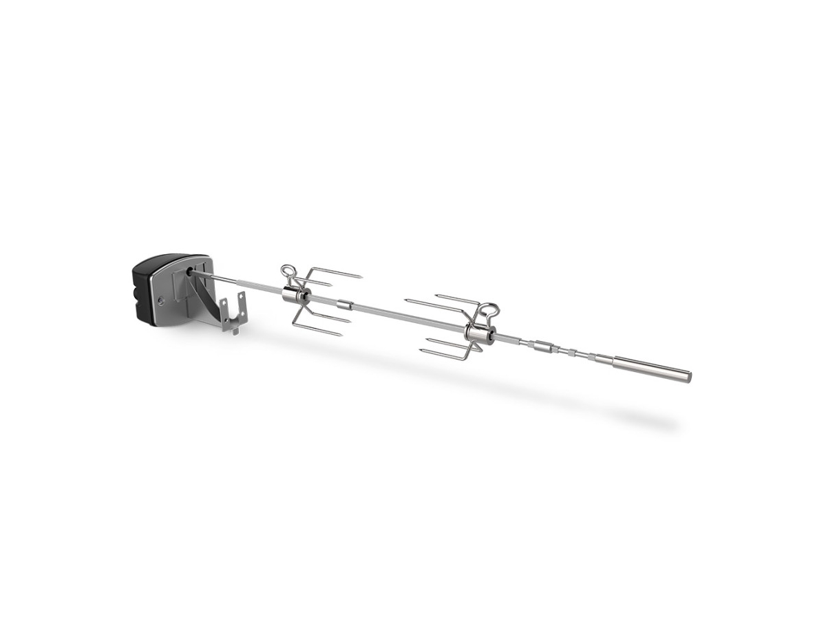 Cette rôtissoire pour barbecues Weber Spirit et Searwood permet de cuire vos viandes à la broche avec une cuisson homogène, garantissant une viande moelleuse à l'intérieur et croustillante à l'extérieur. Elle comprend deux fourches réglables et un moteur électrique pour une rotation autonome. Compatible uniquement avec les barbecues Weber Spirit et Searwood.