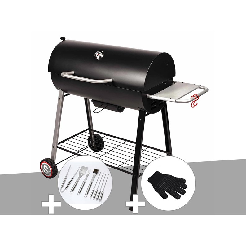 Barbecue à charbon sur chariot michigan + malette de 8 accessoires inox + gant d