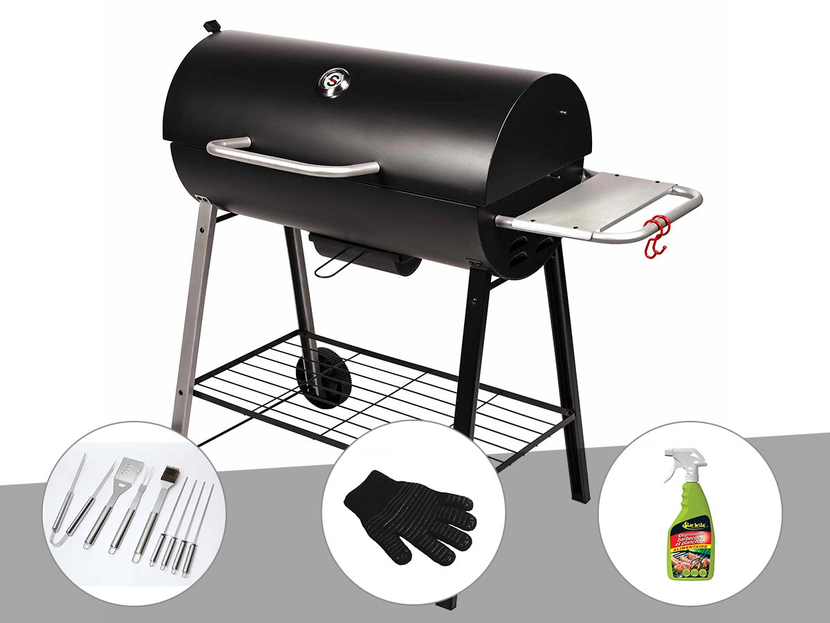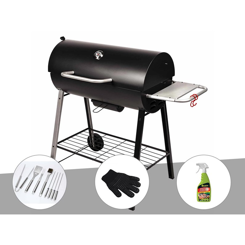 Barbecue à charbon sur chariot michigan + malette de 8 accessoires inox + gant d