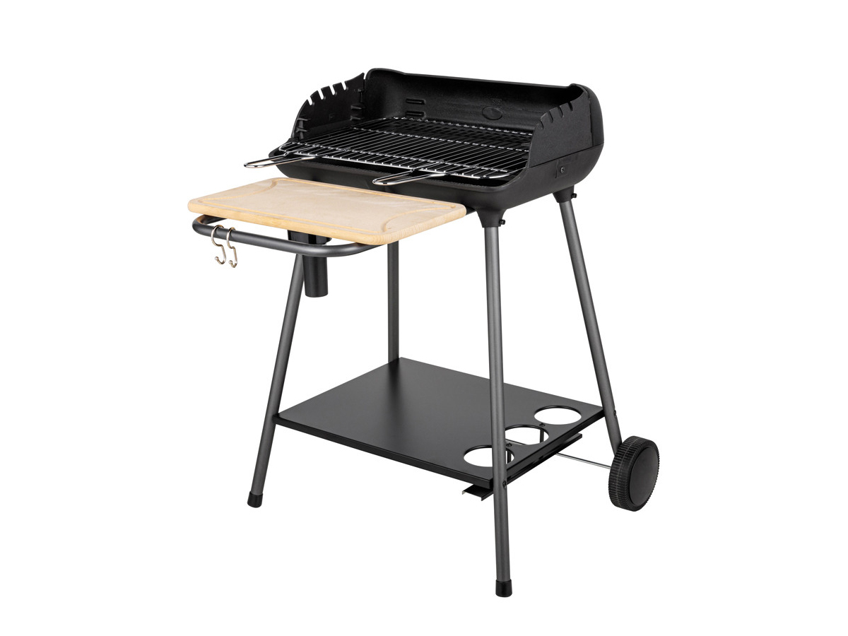 Sa grille de cuisson en acier chromé de 51 x 37 cm, avec une hauteur réglable, garantit une cuisson uniforme et savoureuse. Le chariot, stable et robuste, est équipé d'une tablette frontale en bois amovible et d'une plateforme de rangement pour une organisation pratique de vos ustensiles de cuisson.