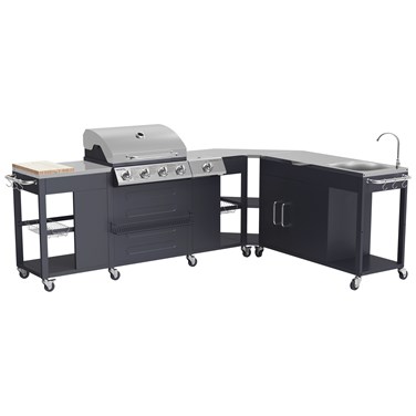 Cette cuisine d'angle d'extérieur spacieuse est équipée de 4 brûleurs, d'un réchaud latéral et d'un évier, et offre une cuisson puissante et homogène pour des résultats délicieux à chaque fois. Vous pourrez régler facilement la température des brûleurs pour cuire vos aliments avec précision. De plus, tous les accessoires essentiels sont inclus pour faciliter votre expérience de cuisine en plein air : un bac à épices, une planche à découper, 2 grilles, 2 paniers, 6 crochets et 12 roulettes avec frein. La finition en acier inoxydable de haute qualité lui confère un look élégant et intemporel, tout en garantissant sa durabilité et sa résistance aux intempéries pour pouvoir l'utiliser de nombreuses années.