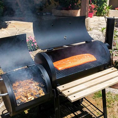 D'un côté vous remplissez de charbon de bois et de l'autre vous disposez votre viande, votre saumon ou tout autre poisson sur la grille. Le fumoir Somagic est parfait pour fumer vous-même vos aliments dans votre espace extérieur. Il est composé d'un capot avec un thermomètre et d'un système d'aération en cheminée. L'appareil comporte également un bac de récupération des graisses amovible, pour un nettoyage plus facile après usage. Il dispose aussi d'une tablette frontale en bois et d'un panier pour le rangement. Déplacez-le facilement grâce à ses deux roulettes. Ce fumoir au charbon de bois est idéal pour la cuisson au grill de vos aliments dès l'arrivée des beaux jours, pour une table de 8 à 10 personnes.