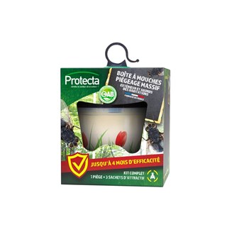 Boîte livrée avec 3 sachets-appâts (hydro-solubles).Pratique d'emploi (uniquement rajout d'eau).Économique (réutilisable)Durée d'attraction : environ 4 mois.Volume de piégeage : 75 cl.Hauteur : 14 cmLargeur : environ 12 cm