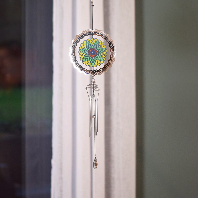 Carillon à vent avec 4 tubes et 1 cosmo spinner rosace. Crochet en S et ressort en fer. Partie supérieure en acier inoxydable. Tubes et partie centrale ronde en aluminium. Partie basse en cristal. Cordes en nylon. Dimensions : 15,2 x 4,5 x 56 cm. Utilisation en intérieur et en extérieur.