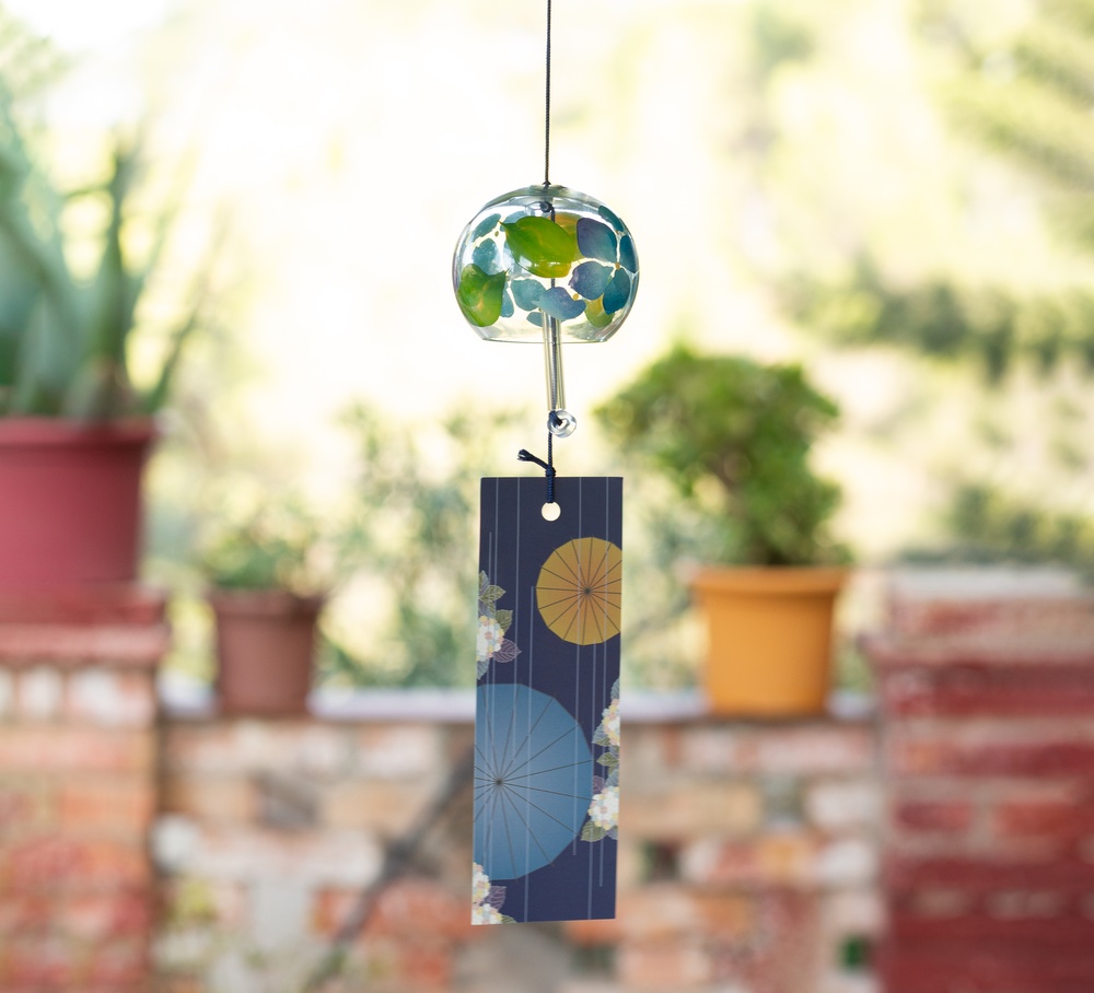Les motifs décoratifs de ces furins en verre représentent souvent des éléments saisonniers ou des images rafraîchissantes, comme la fleur d’hortensia (ajisai), qui pousse dans les endroits frais et humides, évoquant la douceur de la saison des pluies.