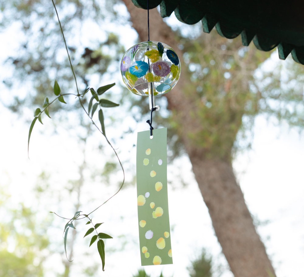 Les motifs décoratifs en verre de ces furins évoquent souvent des éléments saisonniers ou des images apaisantes, comme les couleurs bleues de ces ipomées, ce qui nous apporte de la fraîcheur pendant l'été chaud.