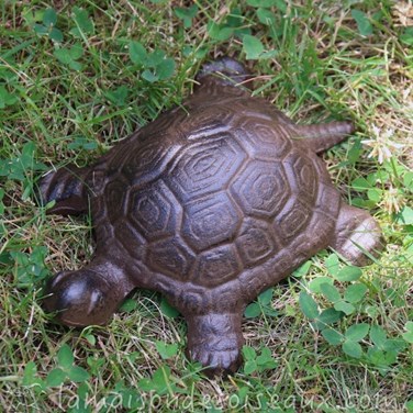 Pour décorer le jardin, ou s'en servir de cale-porte à l'intérieur. Tortue grandeur nature en fonte patine brune. Dimensions: L 19 cm x 15 x H 6 cm. Poids 1kg. LA MAISON DES OISEAUX Décoration du jardin.