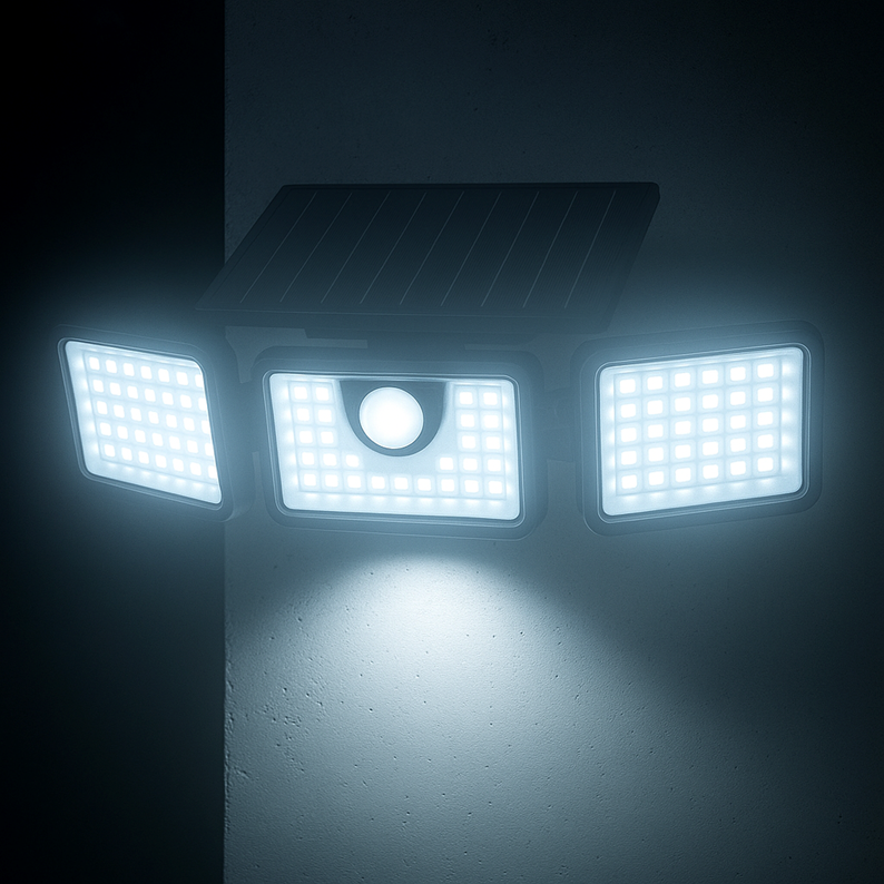 Le lot de 4 projecteurs solaires Falcon à 3 têtes propose un éclairage extérieur puissant de 1000 lumens par unité avec un angle large de 270 degrés. Chaque projecteur est doté de 128 LEDs ultra-lumineuses orientables pour sécuriser efficacement une entrée, un jardin ou un parking. Équipés d'un détecteur de mouvement d'une portée de 5 à 8 mètres et d'un capteur crépusculaire, ils s'activent automatiquement dès la nuit tombée. Leur batterie lithium de 2200 mAh se recharge en 6 à 8 heures d'ensoleillement pour une autonomie technique de 6 heures. Certifiés IP44, ils résistent aux intempéries saisonnières. Ce produit respecte les principes de clarté en fournissant des données techniques précises sans aucune allégation environnementale globale interdite comme vert. L'information est fondée sur des preuves physiques réelles pour garantir un message loyal au consommateur sur les capacités réelles et la longévité de ce système d'éclairage autonome performant.