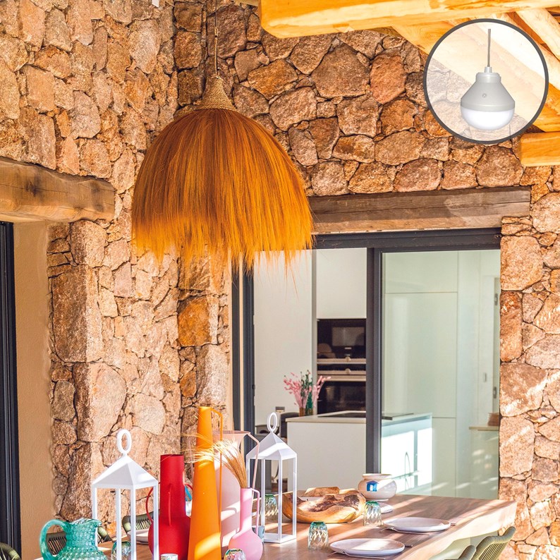 La suspension artisanale Big Masai Nomad est fabriquée à partir d'herbe de rayung séchée offrant un design exotique et majestueux de 80 cm de diamètre pour 62 cm de hauteur. Livrée avec l'ampoule LED autonome Lys, elle propose un éclairage blanc chaud et multicolore RGB ajustable par télécommande. Grâce à son système magnétique sans fil, elle se suspend n'importe où sans aucun besoin de raccordement électrique, offrant une autonomie technique de 11 heures. Certifiée IP44, elle résiste aux projections d'eau pour un usage extérieur durable sous une pergola ou une véranda. Le cordage naturel est reconnu pour sa solidité et sa résistance aux conditions extérieures variées. Ce produit privilégie des données techniques justifiables sans utiliser d'allégations environnementales vagues interdites comme écologique. L'information délivrée est loyale et fondée sur des caractéristiques réelles. Maintenez l'abat-jour au sec.