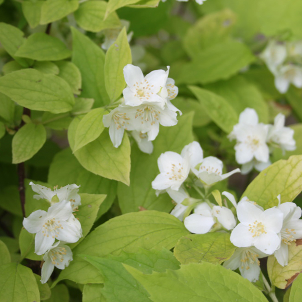 Découvrez le Philadelphus coronarius 'Aureus', plus communément connu sous le nom de jasmin des poètes 'Aureus'. Cet arbuste élégant et dressé séduit par sa floraison spectaculaire en fin de printemps et début d'été, avec ses grappes de fleurs blanc crème, sublimées par quatre pétales soyeux et un parfum enivrant qui rappelle celui du jasmin.