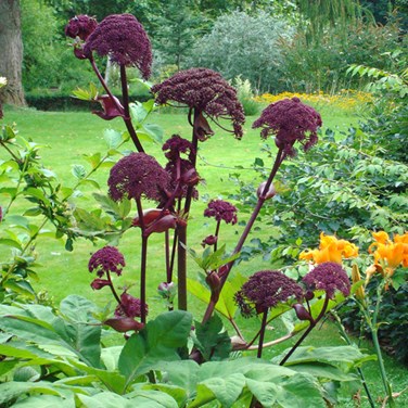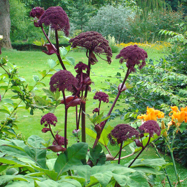 Découvrez l'imposante Angelica gigas, plus communément appelée Angélique gigas ou herbe aux anges. Cette vivace majestueuse, semi-persistante et très érigée trônera avec élégance dans votre espace extérieur. Originaire de milieux humides et ouverts, elle se caractérise par ses grandes feuilles profondément découpées, ses tiges robustes et nervurées, et un parfum captivant qui embaume l'air environnant.