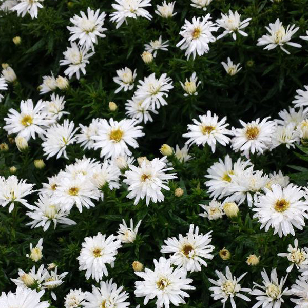 L'Aster 'Kristina' est une variété de plante d'automne qui se distingue par son port compact, érigé et son allure buissonnante. Ses feuilles robustes font d'elle une plante résistante et peu sensible à l'oïdium. Alors que l'été tire sa révérence, l'Aster 'Kristina' vous gratifie de grandes fleurs semi-doubles d'un blanc éclatant, formées en panicules et qui parent votre jardin de leur beauté du fin d'été jusqu'au cœur de l'automne.