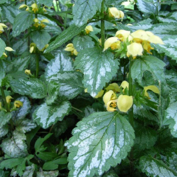 Découvrez le Lamiastrum galeobdolon 'Florentinum', également connu sous le nom de Faux Lamier, une plante ornementale remarquable par son feuillage unique et ses délicates fleurs. Ses feuilles ovales, dentées et crénelées sont d'un vert profond, élégamment panachées de touches blanches ou argentées, ce qui crée un contraste visuel saisissant dans tout aménagement paysager.