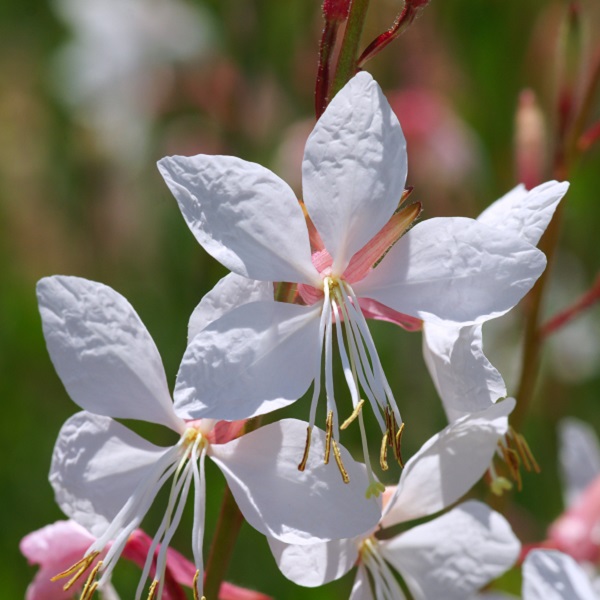 Le Gaura lindheimeri, également connu sous le nom de Gaura de Lindheimeri, est une plante vivace élégante qui arbore en été des panicules de fleurs délicates. Ses pétales blancs, touchés de nuances de rose ou de brun à l'extérieur, dansent au gré du vent sur des tiges fines et gracieuses. Les feuilles de la plante sont lancéolées et d'un vert clair rafraîchissant, apportant une touche de légèreté et de naturel au jardin.
