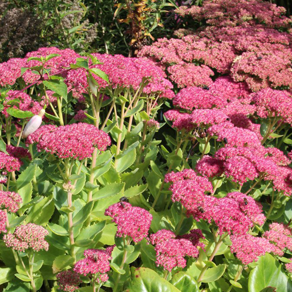 Le Sedum 'Herbstfreude', ou Orpin d'automne, est une plante succulente particulièrement attrayante grâce à son joli feuillage charnu de couleur vert-gris et sa forme en touffes denses. De juillet à août, elle se pare de somptueuses fleurs débutant par un rose-clair avant de s'assombrir en un rouge-rosé foncé, pour finalement atteindre des tonalités brun-rouge cuivrées.