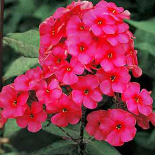 Découvrez le Phlox paniculata 'Starfire', une variété de phlox paniculé aux multiples atouts. Ce phlox vivace se distingue par son port droit et érigé, agrémenté de feuilles lancéolées, vert-foncé et finement dentées, qui composent un feuillage caduc des plus élégants. Lorsque vient la période estivale, de juillet à septembre, il nous offre un spectacle olfactif et visuel incomparable grâce à ses fleurs au parfum envoûtant. Celles-ci se parent d'un rouge intense, accentué d'un œil rouge-violacé, formant des grappes majestueuses qui trônent fièrement au-dessus des feuilles.