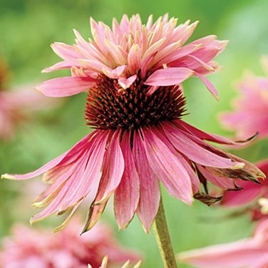 Découvrez l'Echinacea purpurea 'Doubledecker', aussi appelée Rudbeckia pourpre 'Doubledecker', une vivace remarquable avec ses fleurs doubles roses élégantes. Cette variété se distingue par une deuxième rangée de fleurs épanouies reposant majestueusement sur un cône central brun, offrant une touche originale à votre jardin. Les feuilles vert moyen de cette plante, étroites et ovales, sont finement bordées de dents délicates, ajoutant un intérêt textural.
