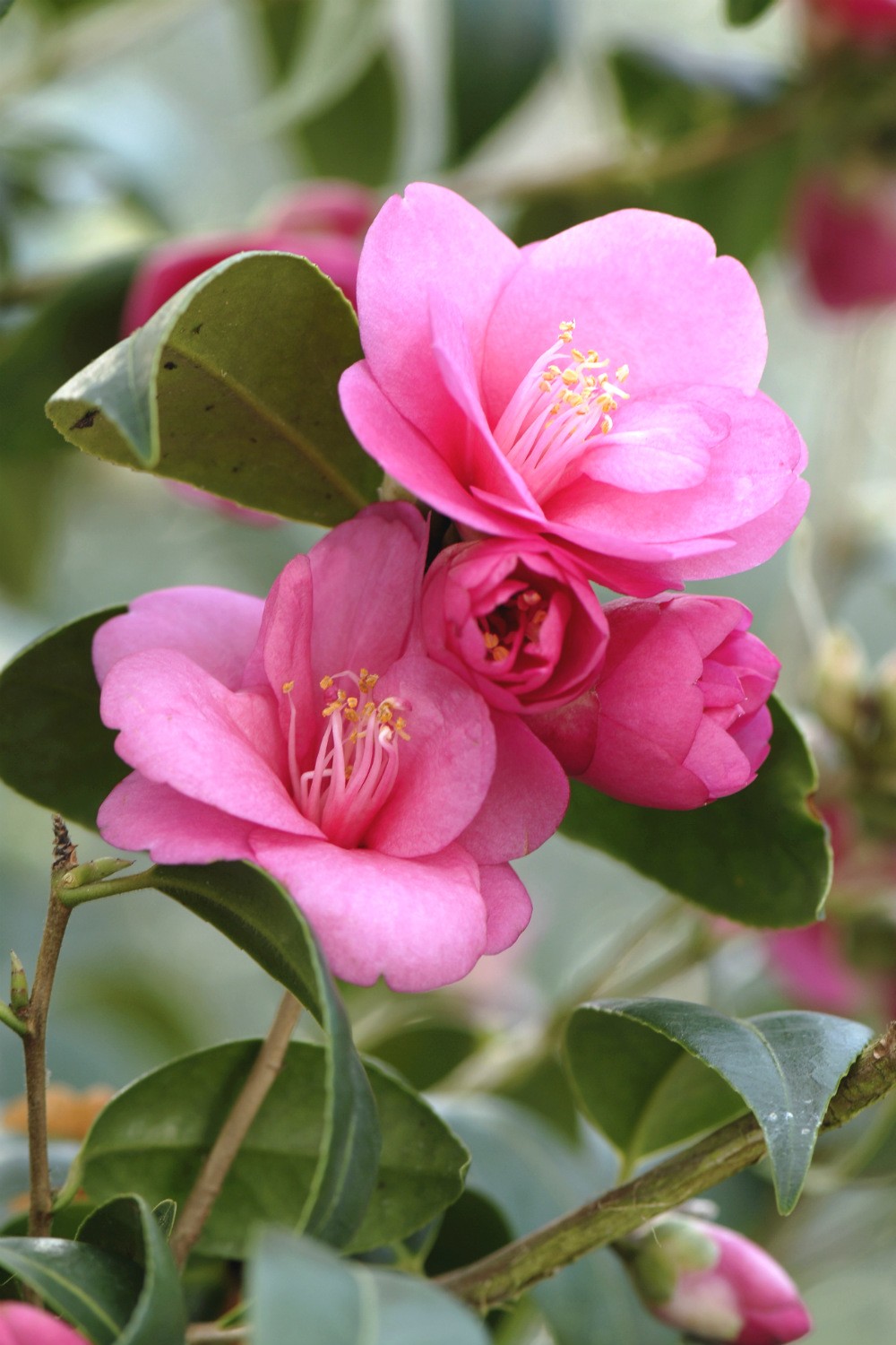 Superbe variété de Camélia affichant un port très buissonnant et des jeunes pousses d'une couleur pourpre ravissante. Très florifère, cet arbuste déploie sa splendeur en fin d'hiver, se couvrant d'une multitude de petites fleurs d'un rose vif.