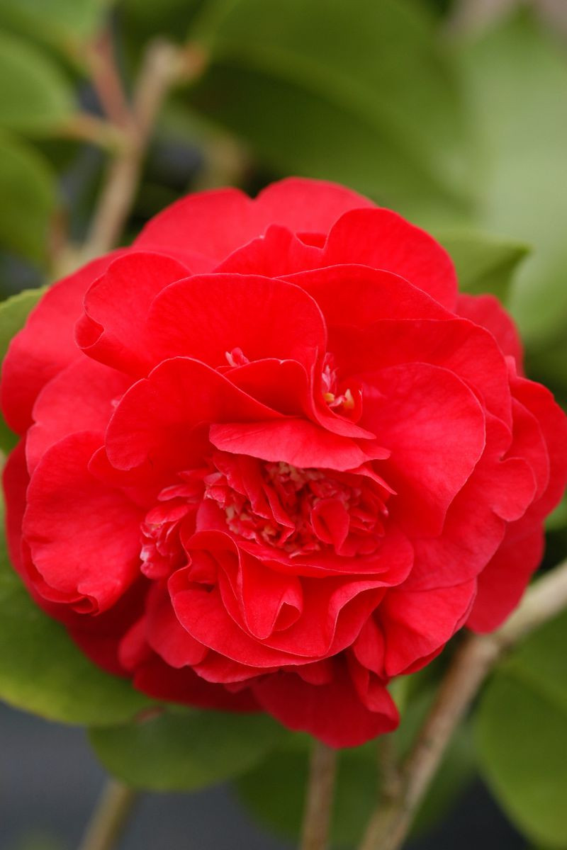 Cette variété de camélia du Japon se démarque véritablement par sa floraison très double d'un rouge carminé très soutenu. Les fleurs éclosent en masse de février à avril sur un feuillage vernissé d'un vert assez foncé.