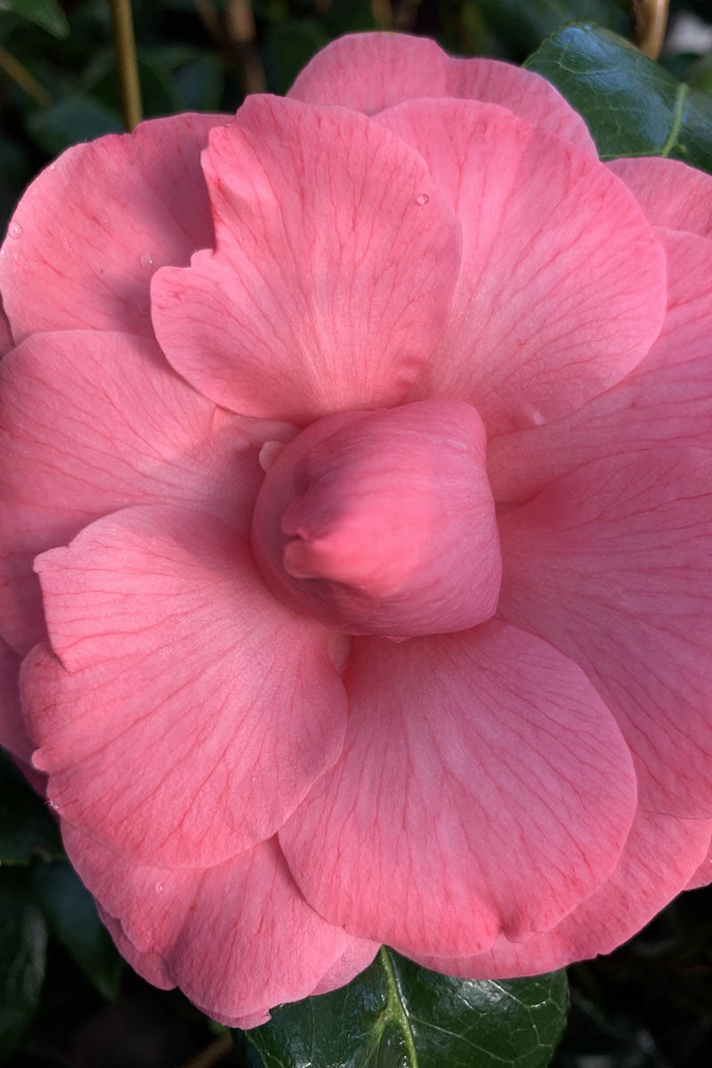 De janvier-février à avril, suivant les régions d'implantation, cette ancienne variété de camélia offre une profusion de fleurs doubles péoniformes aux nombreux pétales légèrement chiffonnés. Pareilles à des bonbons, elles affichent un rose soutenu d'une exceptionnelle intensité. Cette floraison est d'autant plus attractive qu'elle contraste avec le feuillage lustré vert sombre. Les feuilles persistantes sont ovales et pointues.
