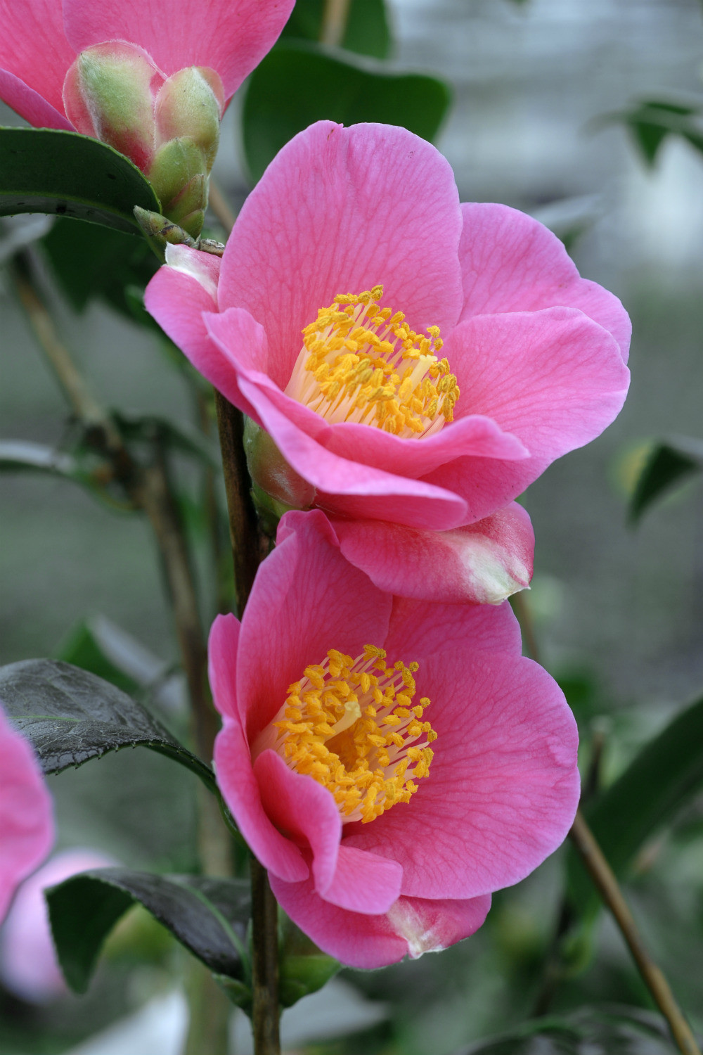 Une abondance de fleurs au rose vif éclatant. Camélia offrant en plus un changement de teintes du feuillage avec des pousses rouges au printemps puis des petites