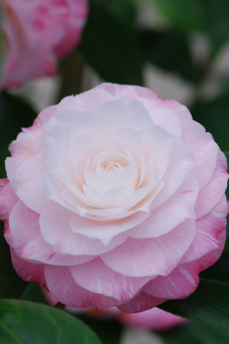 Ce camélia, obtenu aux États-Unis, offre une floraison tout en délicatesse. Les fleurs sont blanches largement lavées d'un rose d'une grande douceur et éclosent sur un feuillage brillant vert foncé.