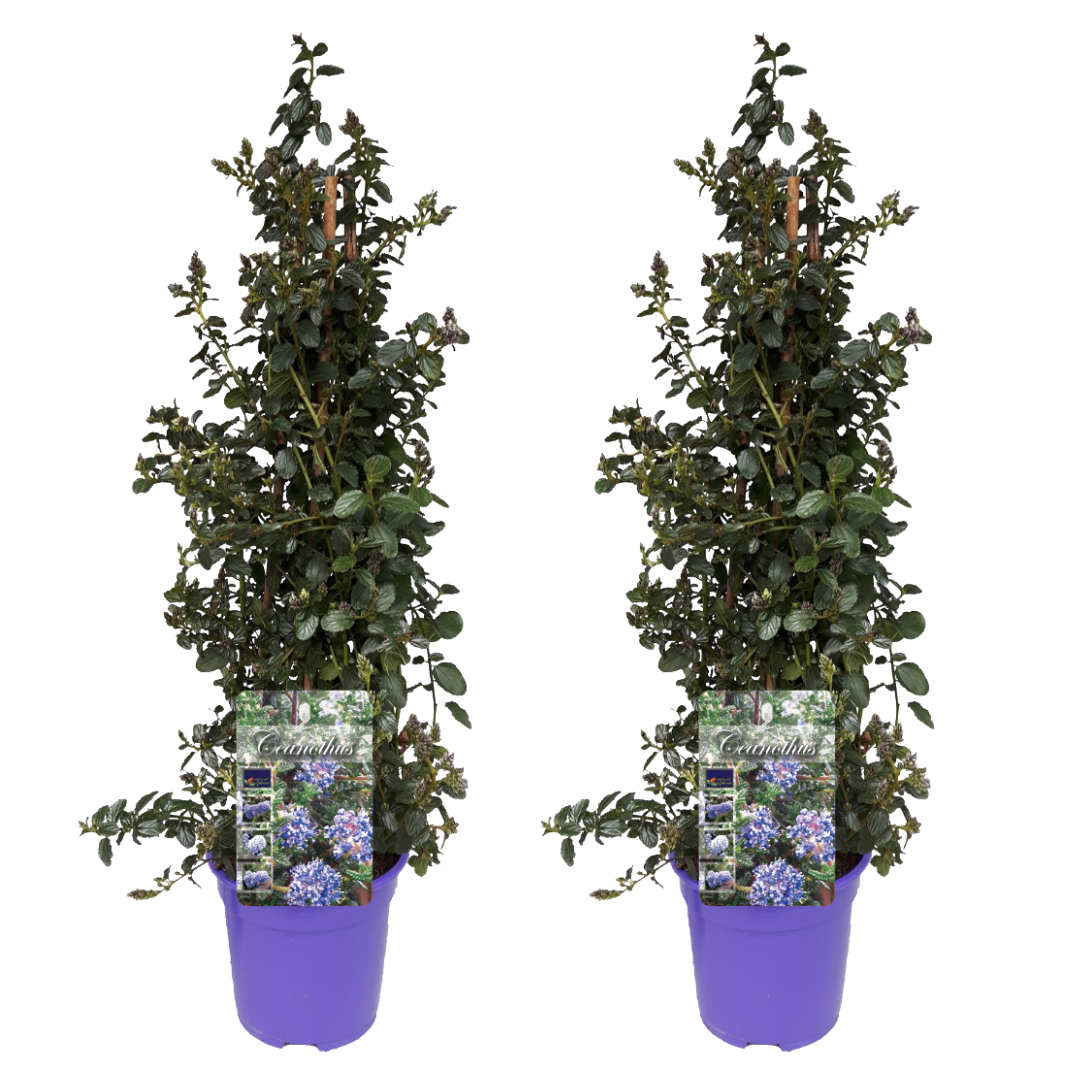 Égayez votre jardin avec ce magnifique Céanothe ! Le Ceanothus thyrsiflorus Repens est une plante qui produit des fleurs violettes au printemps. À l'origine, la plante vient des États-Unis, mais elle pousse aussi au Mexique et au Guatemala. Les feuilles sont brillantes et restent vertes tout l'hiver, donc même si la plante ne fleurit pas, elle continue à apporter du charme à votre jardin. Ce Ceanothus en particulier pousse sur une pyramide de bâtons de bambou ce qui lui donne un aspect très aérien.
