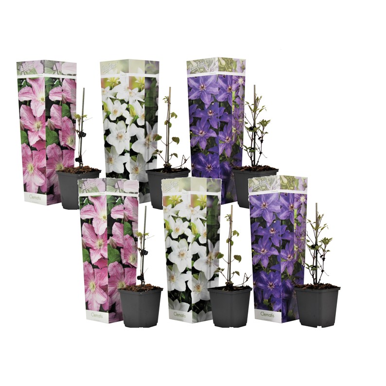 La clématite est l'une des plantes de jardin les plus populaires depuis des centaines d'années. Même les anciens Grecs et Romains en étaient fans. La clématite étant populaire depuis l’Antiquité, il existe aujourd’hui de nombreux hybrides. La Clématite est aussi appelée la reine des grimpeurs. Il est facile d’entretien, a une longue période de floraison et existe dans toutes sortes, couleurs et tailles. Ce mélange contient 3 Clématites grimpantes très différentes, à savoir les espèces suivantes :