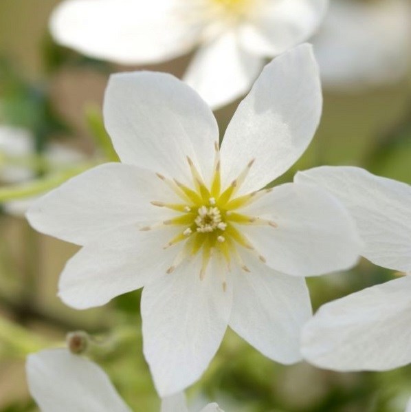 La floraison de la Clématite 'Joe' se déroule d'avril à mai, vous offrant un nuage de petites fleurs blanches odorantes, surmontées d'étamines jaunes. Ces fleurs sont non seulement ravissantes mais également très parfumées, ajoutant une dimension olfactive à votre jardin ou terrasse.