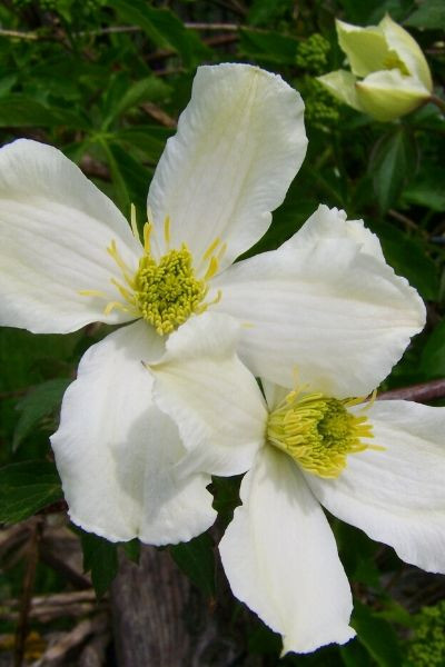 Variété très vigoureuse de Clématite, 'Grandiflora' est très florifère et produit une multitude de grandes fleurs blanc pur dès le mois de mai.