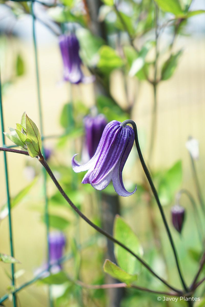 La clématite integrifolia Roguchi' est une originale, d'une générosité incroyable, elle ne grimpe pas mais buissonne à volonté, vivace, elle disparaît complètement l'hiver. Du printemps à la fin de l'été elle fortifie ses tiges volubiles de façon exponentielle. Elle fleurit de juin à septembre sans s'arrêter. Ses petites fleurs d'environ 4 à 5cm de hauteur sont bleu nuit et ressemblent à d'adorables et attendrissantes clochettes suspendues. Le bleu violacé, sombre de la fleur forme un très beau contraste avec le feuillage vert sombre luisant. Ses feuilles sont entières et ovales. Au c ur de la fleur un bouquet d'étamines entoure le pistil, de couleur crème, ensemble ils vont donner des fruits plumeux, duveteux, très décoratifs.