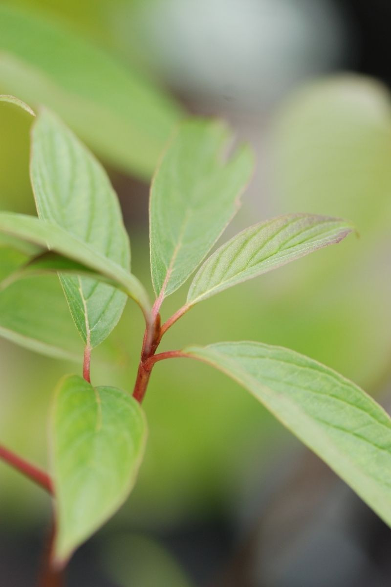 Au printemps, ses rameaux colorés se couvrent de feuilles ovales, nervurées, légèrement ondulées et pointues, d'un vert moyen. Ensuite, entre mai et juin, les fleurs apparaissent discrètement. De couleur blanche, elles sont disposées en corymbes. Elles sont surtout intéressantes pour leurs propriétés mellifères. Arrivent ensuite de petites baies bleutées. L'automne arrivant, ce feuillage se pare d'une jolie teinte rouge pourpré avant de tomber.