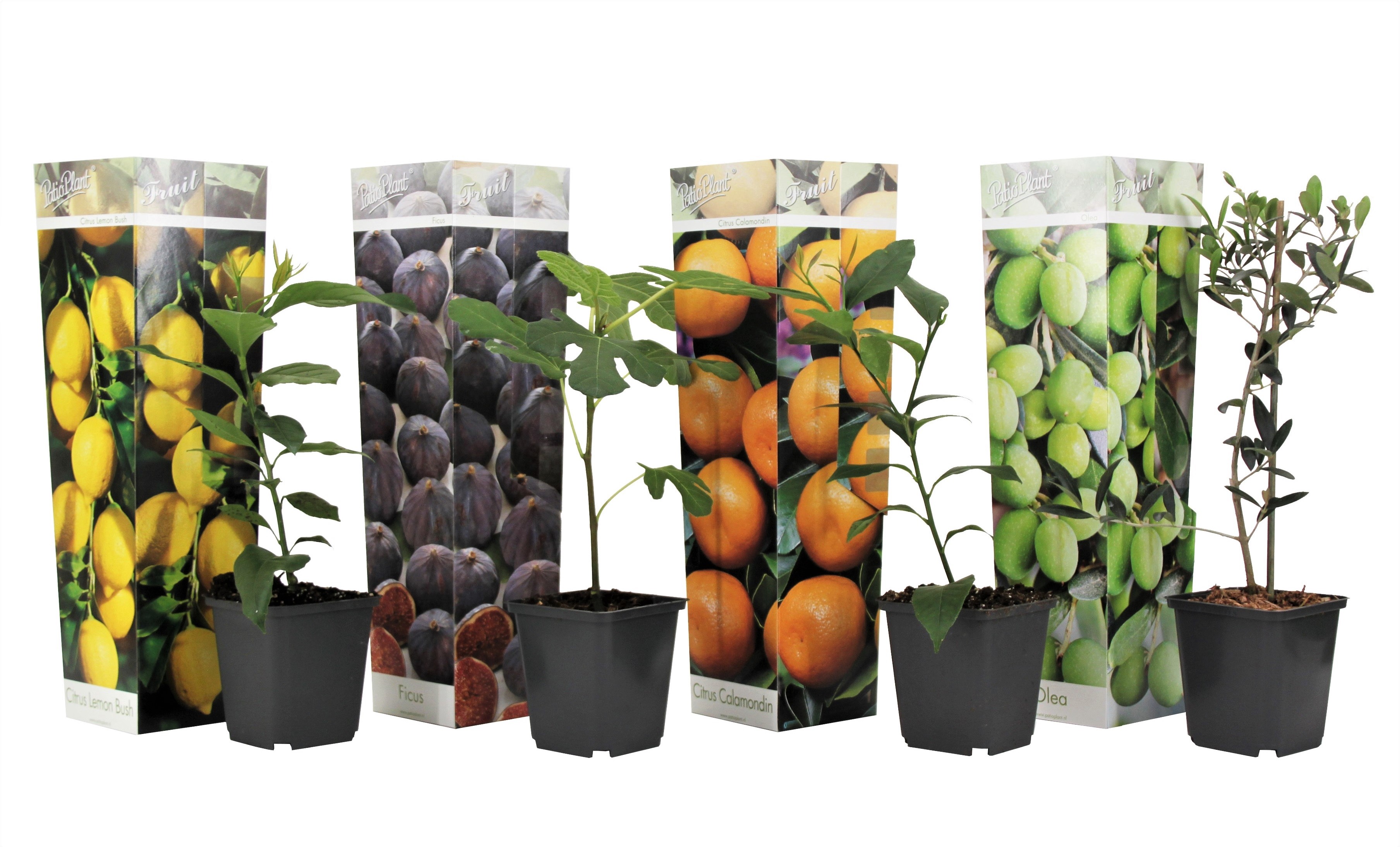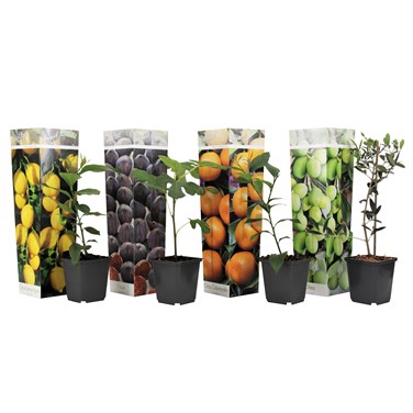 Imaginez-vous en Méditerranée et démarrez votre propre mini verger avec ce joli ensemble de 4 arbres fruitiers méditerranéens ! L'ensemble se compose d'un olivier, d'un figuier, d'un citronnier et d'un oranger. Les arbres fruitiers sont fournis avec une hauteur comprise entre 25 et 40 cm. Vous recevez ainsi un véritable package de culture à faire soi-même. Serez-vous capable de faire pousser ces arbres fruitiers en grands arbres ? L'ensemble se compose des types Olea Europaea (olivier), Ficus Carica (figuier), Citrus Limon (citronnier), Citrus Mitis Calamondin (orange).