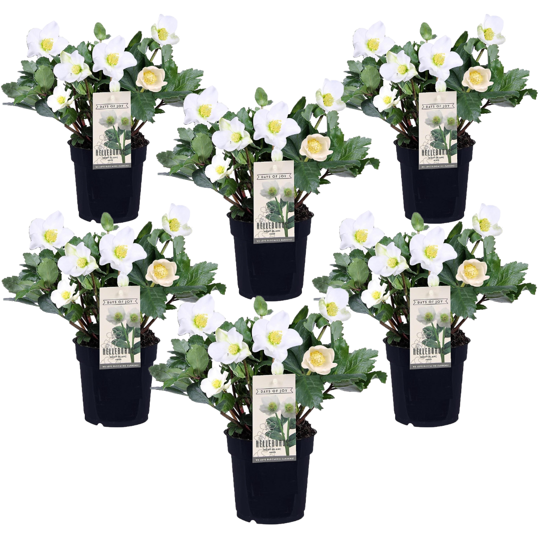 L'hellébore Niger Mont Blanc, également connu sous le nom de rose de Noël, est un atout pour chaque jardin. Cette plante robuste fleurit en hiver avec de belles fleurs blanches en forme de soucoupes. La rose de Noël est particulièrement populaire en raison de sa période de floraison, car elle se situe entre janvier et avril, alors que de nombreuses autres plantes sont encore en hibernation. Les fleurs blanches de l'hellébore Mont Blanc peuvent devenir roses à la fin de sa floraison. La rose de Noël est originaire des zones montagneuses calcaires avec des forêts de conifères des Alpes orientales et des Apennins du Nord. Les feuilles spatulées de l'hellébore Mont Blanc sont plus longues et plus fines que celles de nombreuses autres espèces et hybrides d'hellébore. Le nom 'Helleborus' vient des mots grecs elein, qui signifie blesser, et borus, qui signifie nourriture. Cela signifie que le nom de la plante fait référence à sa toxicité.