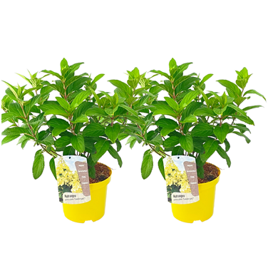 Hydrangea paniculata 'Candlelight' est un hortensia à floraison précoce. Il pousse à une hauteur de 100-150 cm et fleurit abondamment avec de grandes fleurs blanc crème à jaune pâle. La belle floraison commence en mai et peut durer jusqu'en juillet. Avec le temps, les fleurs blanches prennent une teinte jaune clair. Les feuilles vertes foncées font ressortir les fleurs et les tiges ont une couleur rouge frappante qui donne à l'hortensia Candlelight un aspect unique. La plante est à feuilles caduques et résistante. L'hortensia Candlelight s'épanouit aussi bien en pleine terre que dans un grand pot, ce qui le rend idéal pour tous les types et tailles de jardins.