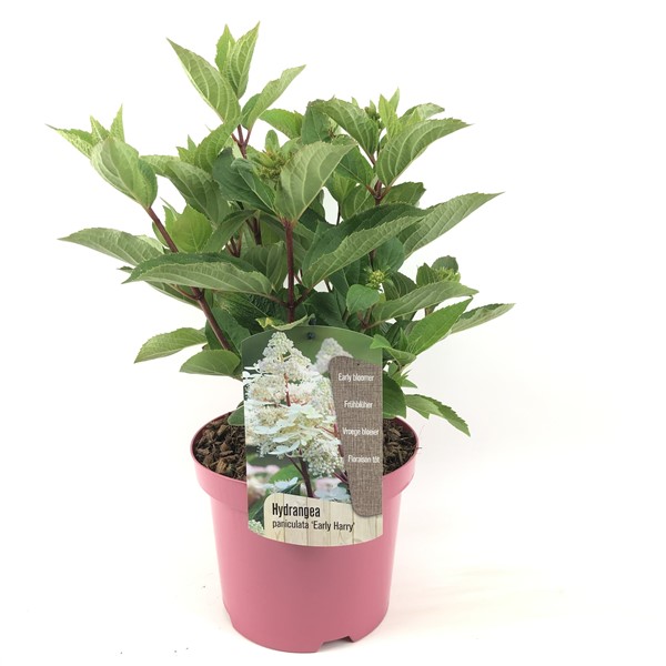 Hydrangea paniculata 'Early Harry' est un hortensia paniculé à floraison très précoce. Il mesure entre 100 et 150 cm de haut et a une floraison riche avec de grandes fleurs blanc crème à rose tendre. La belle floraison commence en mai et peut se poursuivre jusqu'en juillet. Les fleurs blanches prennent une teinte rose tendre au fil du temps. Les feuilles vertes foncées font ressortir encore plus les fleurs. En automne, les feuilles deviennent jaunes avant que l'hortensia ne perde ses feuilles pour l'hiver. L'hortensia Early Harry se plaît aussi bien en pleine terre que dans un grand pot, ce qui le rend parfait pour tous les types et toutes les tailles de jardin.