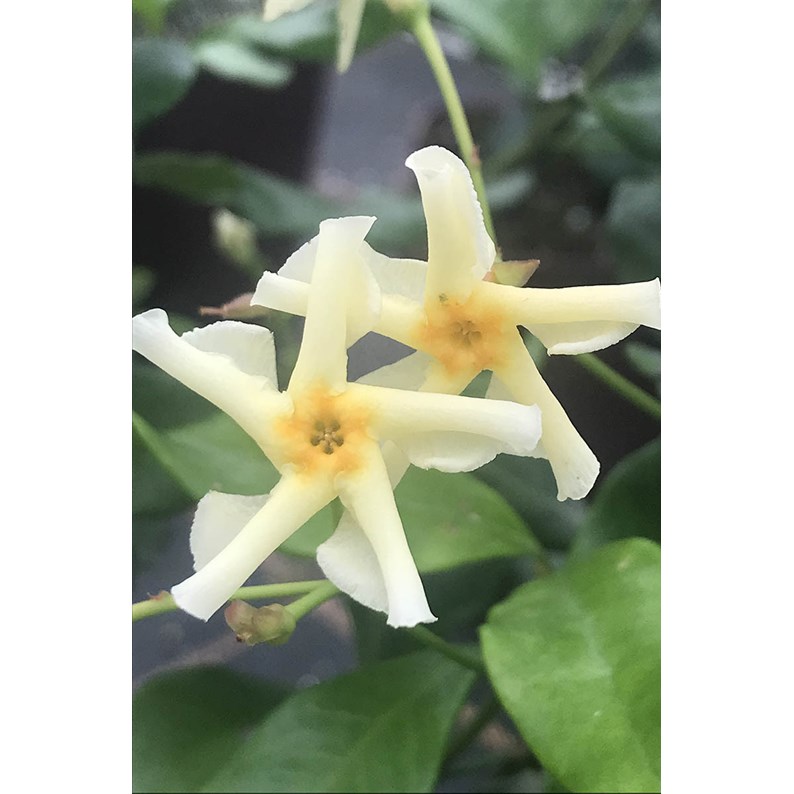 Assurément, cette variété de jasmin étoilé déploie des trésors d'imagination et de séduction pour se démarquer. Il affiche sa différence par ses petites grappes de fleurs blanc-crème qui deviennent jaunes, avec un c ur jaune d'or. Les premières fleurs éclosent de mai à juillet, suivant les régions, et remontent en septembre. Cette floraison est surtout divinement parfumée comme toute celle des jasmins étoilés.