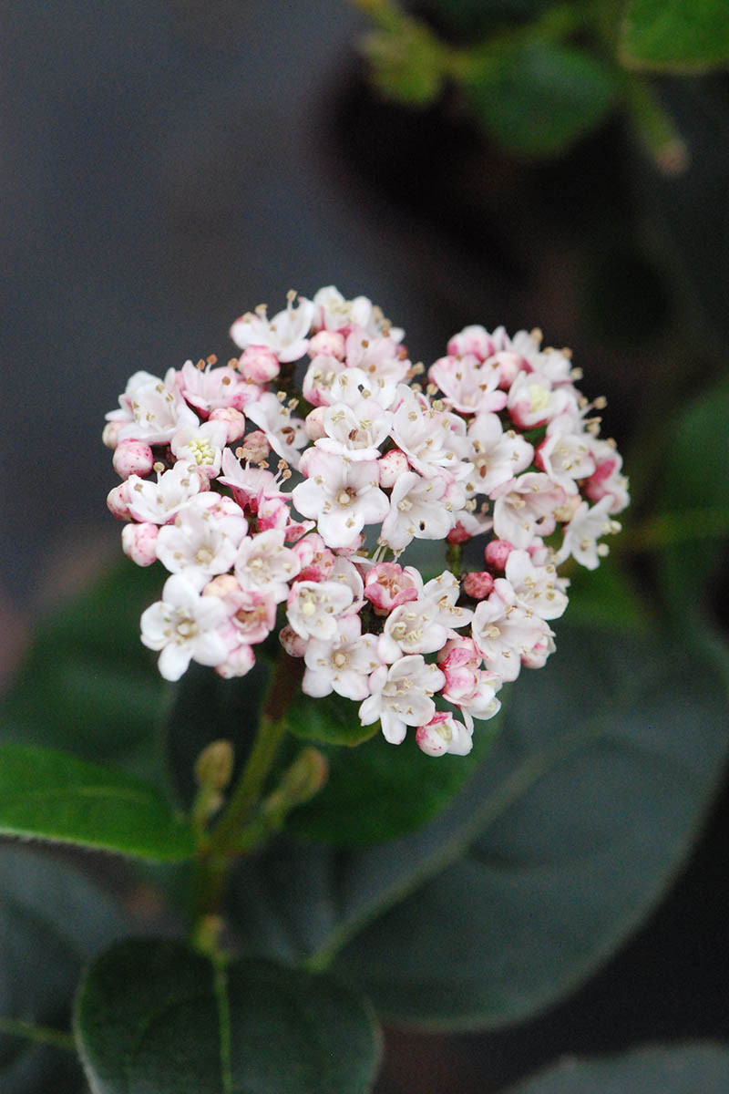Une floraison hivernale est toujours un atout de poids pour un arbuste. Celle de cette variété de Viburnum tinus, plus connu sous le nom de laurier-tin, ajoute un atout supplémentaire : les boutons roses, semblables à des perles, naissent en octobre, et s'épanouissent jusqu'en février en cymes, plates et terminales, rose clair. Ces fleurs sont d'autant plus remarquables qu'elles sont mises en avant par un feuillage persistant, vert sombre et lustré. Une fructification en baies bleues puis noires suit la floraison et fait le bonheur des oiseaux.