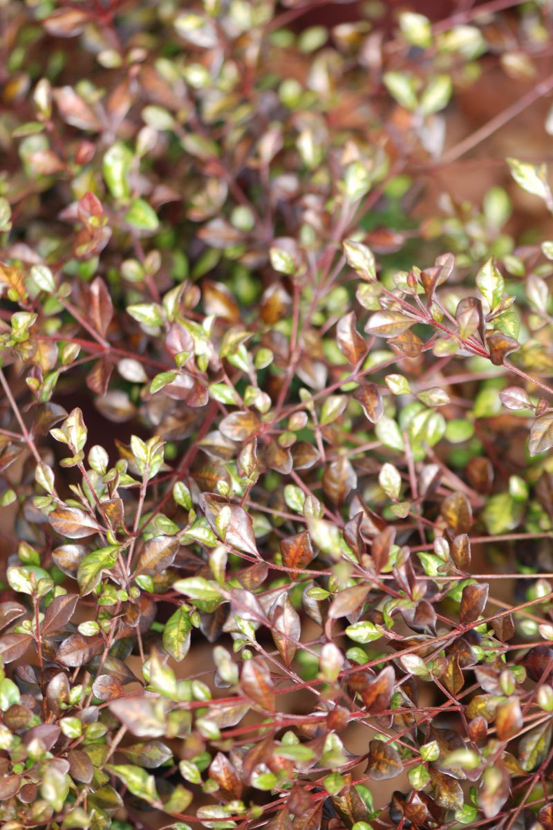 Doté d'un feuillage persistant, coriace et brillant, ce lophomyrtus forme un arbuste au port naturellement dense, dressé et buissonnant. Il est très ramifié et atteint 1,50 m en hauteur pour une largeur de l'ordre de 1,20 m. Ses dimensions seront certainement plus modestes s'il est cultivé en pot. Légèrement cloquées, les petites feuilles exhalent une odeur au froissement. Mais c'est surtout sa couleur qui fait tout son charme. Les feuilles naissent en vert clair légèrement jaune, avant d'adopter une teinte vert foncé à brunâtre.