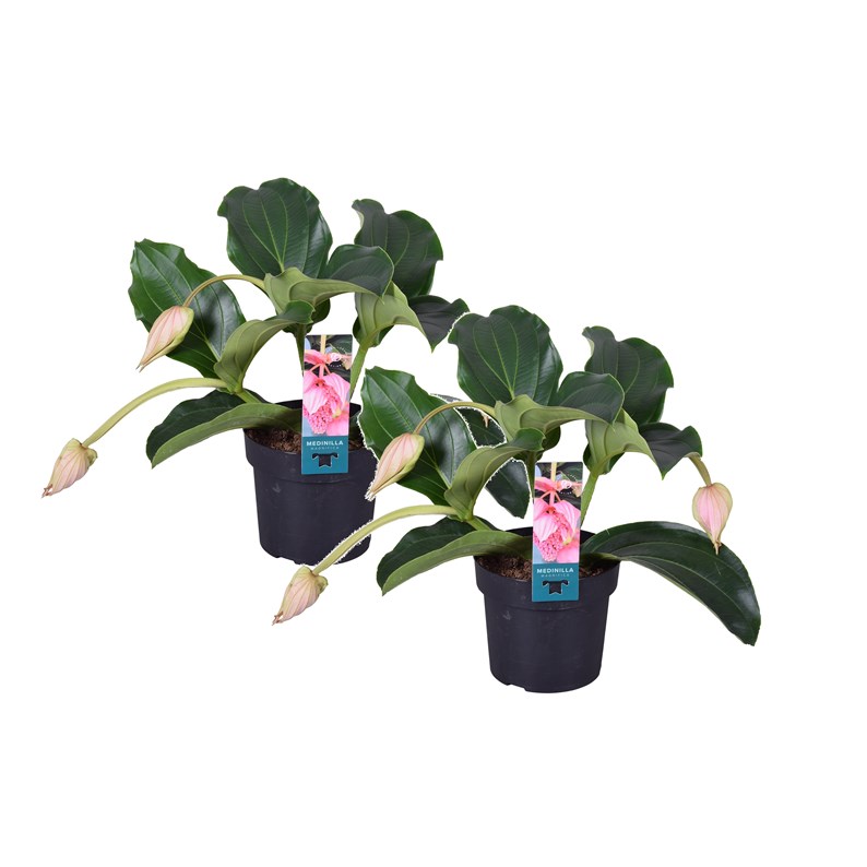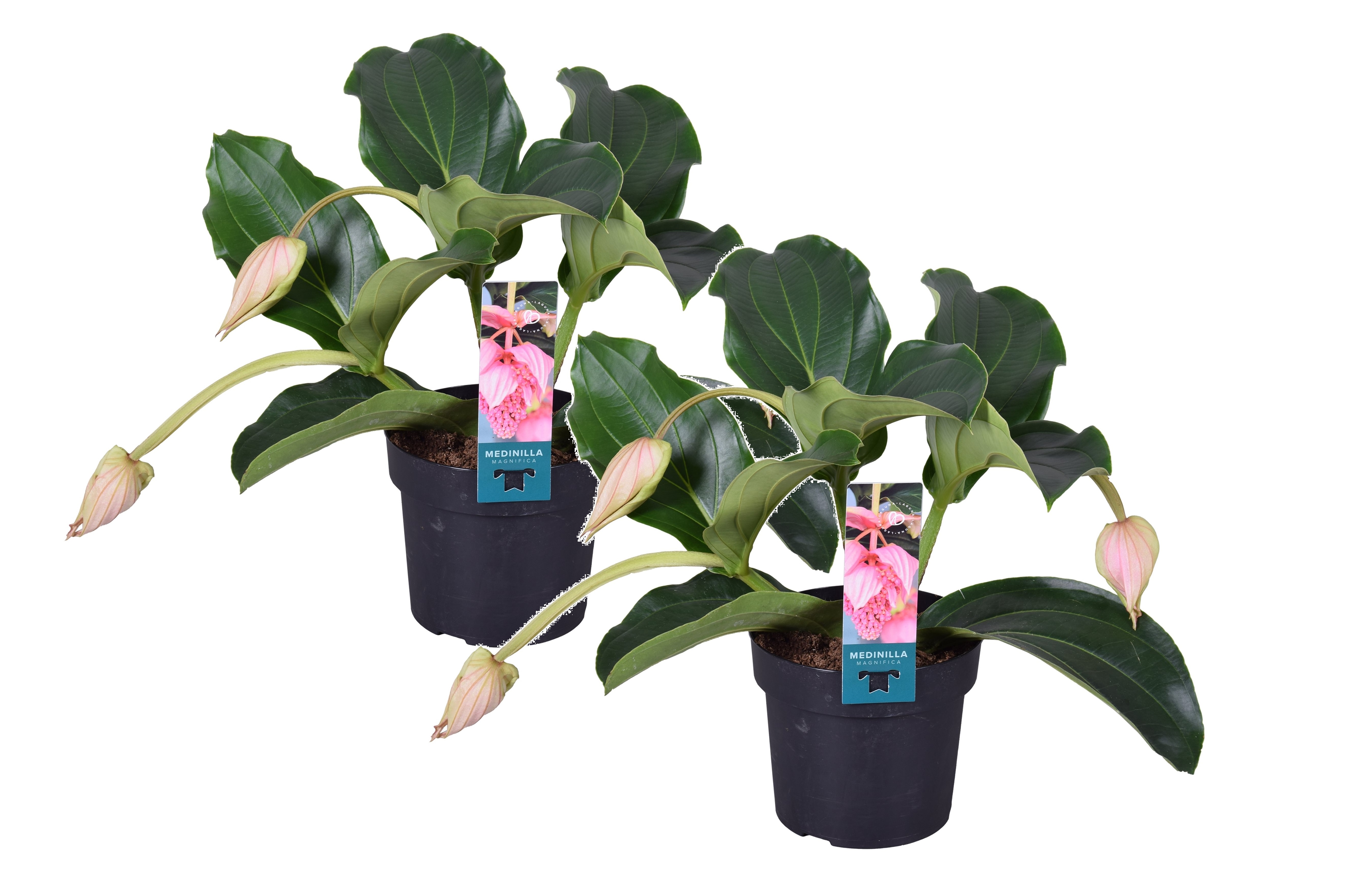 La Medinilla Magnifica Pinatubo est une plante d'intérieur remarquable qui est célèbre pour ses fleurs tombantes. A l'origine, la Medinilla Magnifica vient des Philippines, où les habitants l'appellent la plante 'Kapa-Kapa'. La plante est épiphyte, ce qui signifie qu'elle pousse à la surface d'une plante sans en extraire sa nutrition. Elle tire son humidité et ses nutriments de l'air. Aux Philippines, la médinilla peut atteindre jusqu'à un mètre et demi de haut ! Cependant, elle n'ira pas aussi vite à l'intérieur. En tant que plante d'intérieur, elle peut atteindre un mètre de haut. Entre les gracieuses feuilles ondulées poussent des tiges rectangulaires qui ressemblent à du liège. De grandes fleurs roses poussent sur ces tiges. Dès que ces fleurs s'ouvrent, un autre petit bouquet de fleurs apparaît. Ainsi, il se passe toujours quelque chose de spécial avec la Medinilla Magnifica !