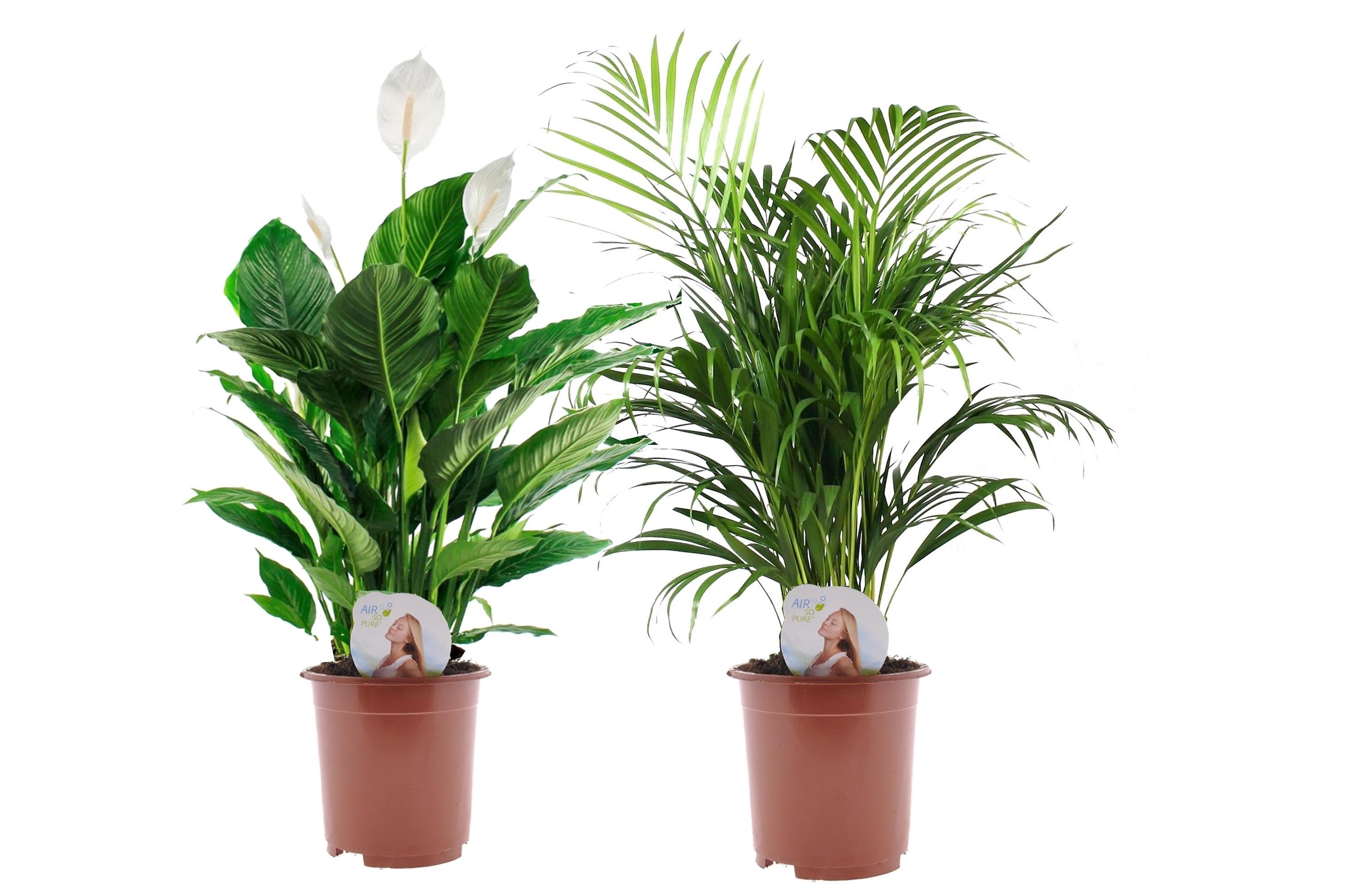 L'Areca Dypsis Lutescens et le Spathiphyllum sont la combinaison parfaite de deux plantes d'intérieur populaires aux fortes propriétés purificatrices de l'air. Le Spathiphyllum est aussi appelé le Lys de la Paix. Les fleurs du Spathiphyllum sont blanches et dépassent souvent au-dessus de la plante, ce qui attire particulièrement l'attention. Un Spathiphyllum peut fleurir plusieurs fois par an s’il est correctement entretenu. La période de floraison dure jusqu'à 10 semaines à la fois ! Le palmier Areca porte de nombreux noms, mais il est surtout connu sous le nom de Palmier d'Or. Le palmier tolère très bien l’air pollué et est donc courant dans les environnements de travail de type bureau. Les deux plantes sont hautement purificatrices de l’air.