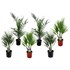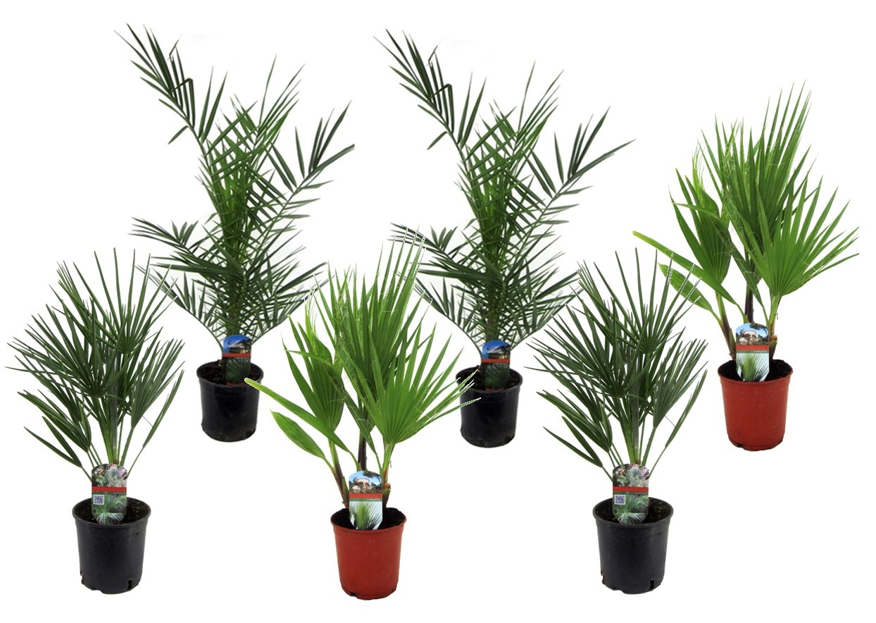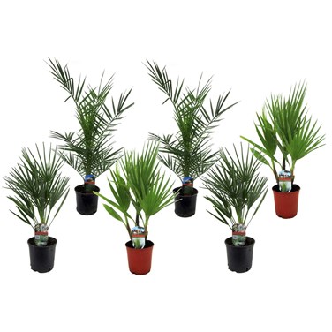 Profitez d'une ambiance estivale toute l'année. Ces palmiers exotiques attirent tous les regards dans le jardin ou sur le balcon ! Ils nécessitent peu d’entretien, sont résistants à l’hiver et très solides. Le mélange de palmiers se compose de trois palmiers d'extérieur différents : Chamaerops Humilis (palmier nain européen), Phoenix Canariensis (palmier dattier des îles Canaries), Washingtonia Robusta (palmier éventail du Mexique).