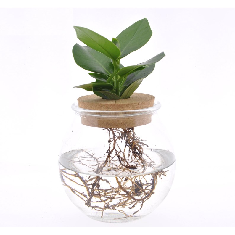 La culture hydroponique est l'une des dernières tendances en matière de plantation. L'hydroponie est une méthode de culture de plantes sans terre, où les plantes reçoivent tous leurs nutriments essentiels par le biais d'une solution d'eau riche en nutriments. Grâce à cette technique, vous appréciez non seulement l'aspect magnifique des feuilles, mais vous pouvez également observer la croissance des racines de la plante. De plus, les plantes hydroponiques sont très faciles à entretenir. Il suffit de changer l'eau de temps en temps (de préférence toutes les deux semaines). Cette belle plante hydroponique est livrée toute prête, avec un vase en verre bulbeux et un bouchon de liège. Il ne vous reste plus qu'à ajouter de l'eau. Et choisir un bel emplacement, bien sûr !
