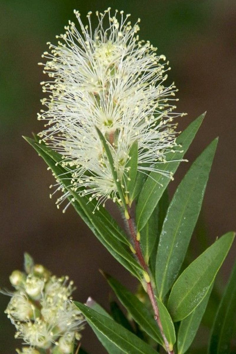 Mais ce qui fait la particularité de ce Callistemon, c'est assurément sa floraison originale pour cette espèce. En effet, en mai-juin, puis plus sporadiquement en août-septembre, cet arbuste offre des inflorescences en épis, semblables à des écouvillons, qui éclosent à l'extrémité des branches. Ces épis, constitués d'étamines saillantes, sont surtout étonnants par leur couleur blanc crème, ponctué de reflets verdâtres. Remarquablement serrés et denses, ces épis se veulent tout de même que plus petits que ceux des autres variétés de Callistemon. Mellifère, cette floraison attire des nuées d'insectes butineurs et pollinisateurs.