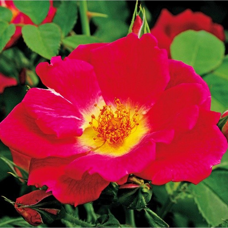 Découvrez Rosa 'Weg Der Sinne'®, une création exceptionnelle de la maison Kordes connue sous le nom de Nectar Rosier. Cette variété séduit immédiatement par ses grandes fleurs semi-doubles, qui se distinguent par une couleur violette intense et rare, rehaussée par un cœur jaune éclatant. Non seulement ces fleurs sont visuellement captivantes, mais elles dégagent également un léger parfum qui enchantera vos sens.
