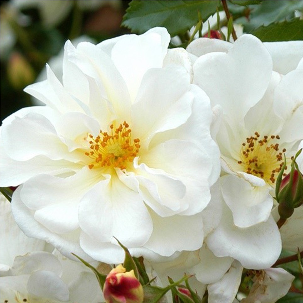 Découvrez la splendeur du Rosa 'Diamant', un rosier couvre-sol distingué, issu de la collection Rigo de la renommée maison Kordes. Cette variété remarquable se pare d'une multitude de fleurs semi-pleines d'un blanc pur, rehaussées par des étamines d'un jaune brillant qui éveillent et illuminent votre jardin.