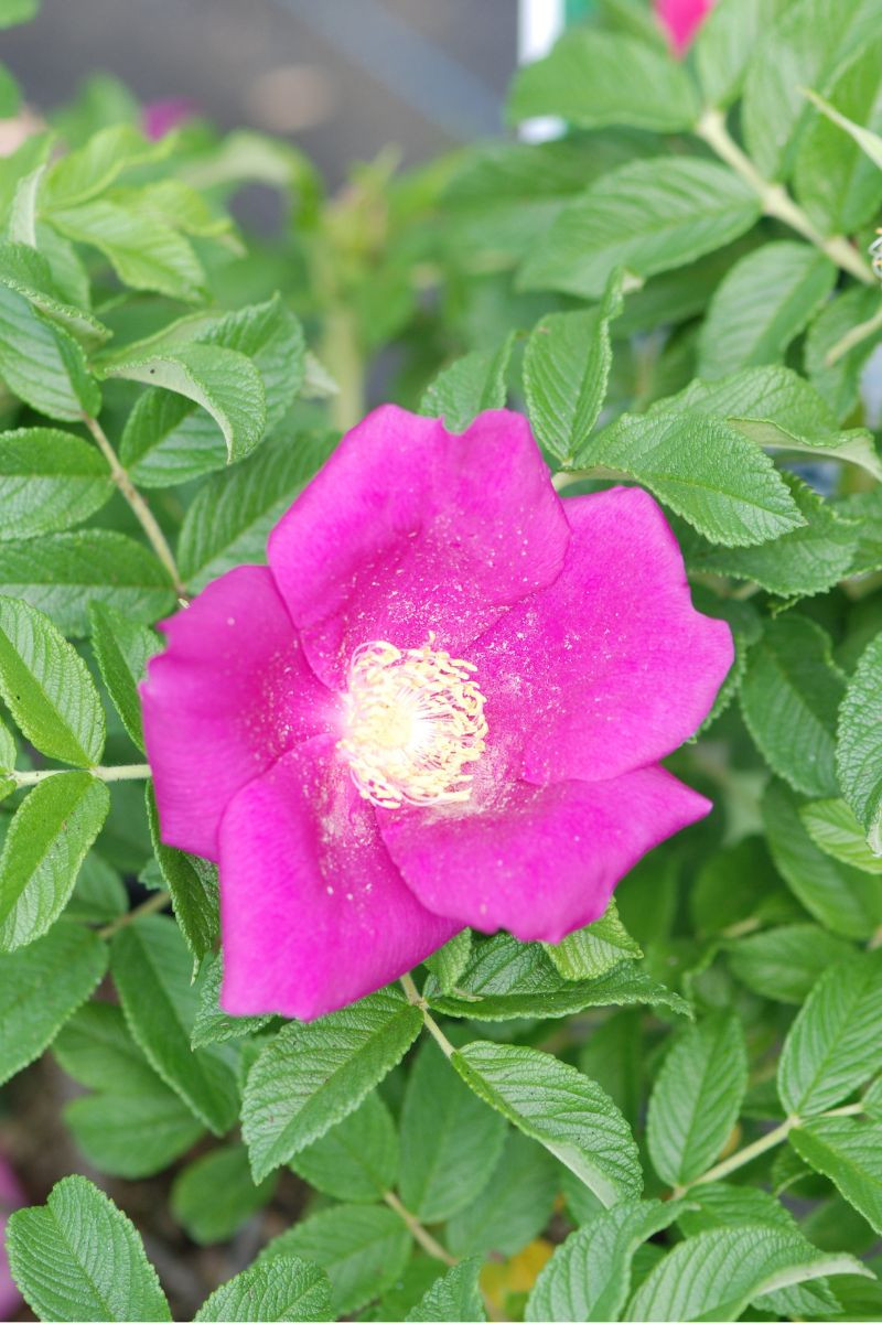 Cette magnifique variété de rosier rugueux offre une floraison rose pourpré, rehaussée d'étamines jaunes, très parfumée. Il forme un buisson touffu.