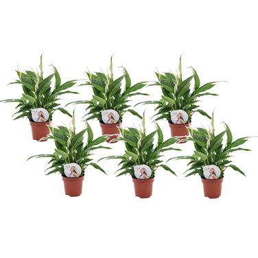 Mieux connues sous le nom de lis de la paix, ces plantes tendres sont réputées pour leur capacité à éliminer les polluants de l'air. Le Spathiphyllum forme une touffe dense de grandes feuilles persistantes, droites et brillantes, aux extrémités légèrement tombantes, qui en font une belle plante d'intérieur toute l'année. Au printemps et au début de l'été, les élégantes spathes blanches sont produites, s'élevant sur des tiges minces au-dessus du feuillage. Ses fleurs blanches rendent le Spathiphyllum beaucoup plus unique et différent des autres plantes d'intérieur vertes. Un Spathiphyllum peut fleurir plusieurs fois par an s'il est bien entretenu. La période de floraison dure jusqu'à 10 semaines à chaque fois, ce qui en fait une plante à floraison exceptionnellement longue !